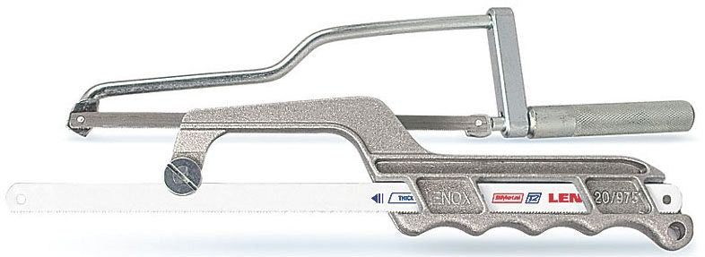 The Lenox 20975975 Compact Heavy Duty Mini Hacksaw is designed for cutting in tight spaces. This handy tool features a robust aluminum handle that ensures durability while providing a comfortable grip. It is ideal for flush cutting applications, making it suitable for various materials including metals and plastics.