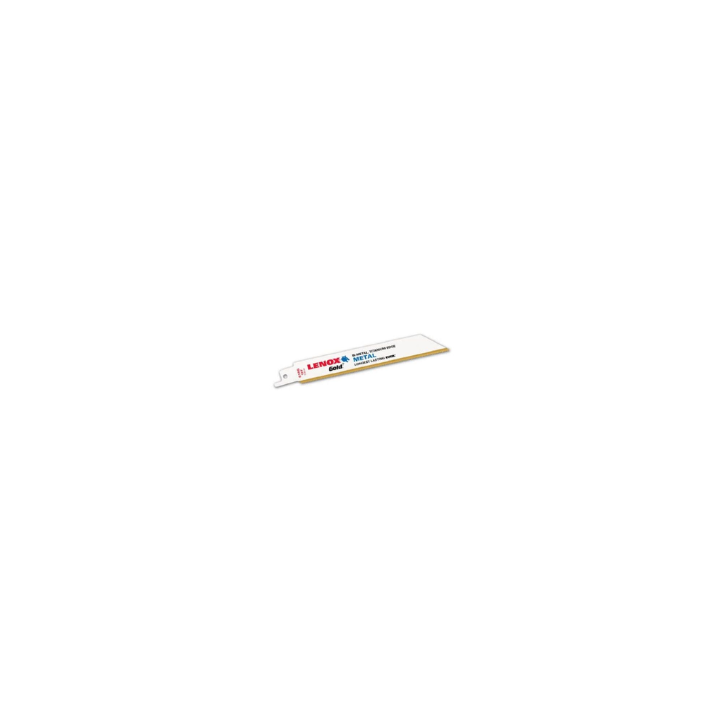 The Lenox 21062956GR is a nine-inch reciprocating saw blade designed for efficient cutting. The blade uses T2 technology, providing up to two times longer life compared to standard straight blades. The titanium coating enhances durability and reduces heat buildup.