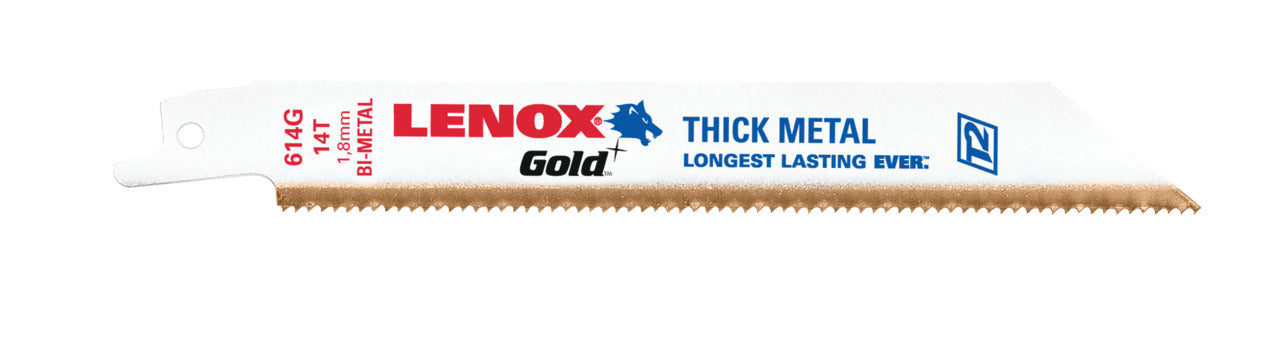 The Lenox 21067614GR is a six-inch reciprocating saw blade designed for cutting a variety of materials. Its bi-metal construction and T2 technology provide durability and extended blade life. The blade features a titanium coated finish for heat resistance, ensuring consistent performance during use.