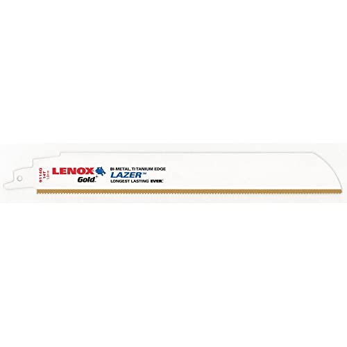 The Lenox 210989114GR Gold Power Arc Reciprocating Saw Blade is designed for cutting thick and medium metals. Each package includes five 9-inch, 14 TPI blades. Known for durability, this blade offers enhanced performance for professional use.