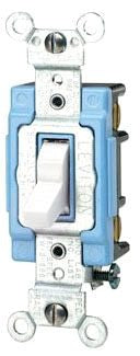 The Leviton 1203-LHW is a 15 Amp, 120 Volt lighted handle illuminated toggle switch designed for 3-way applications. This switch features a self-grounding mechanism and is suitable for industrial and commercial use. The toggle switch has a white thermoplastic body and is equipped to handle extra heavy-duty applications.
