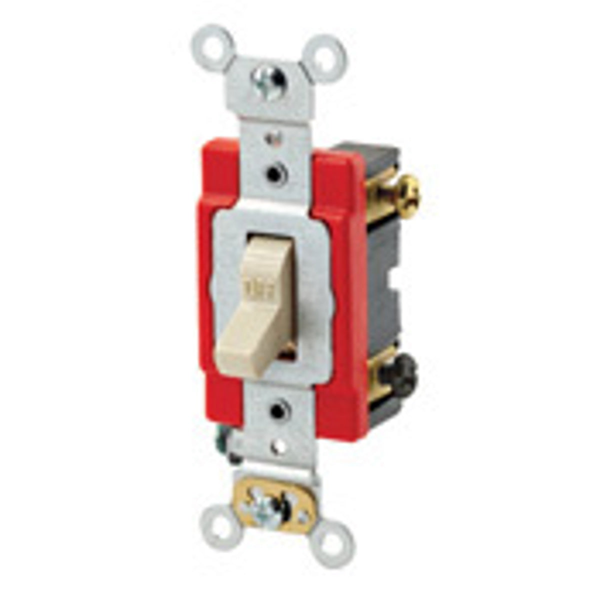 The Leviton 1222-SI is a toggle switch designed for industrial applications, operating at 20 Amps and 120/277 Volts. This switch features a rugged construction that ensures reliability in high-demand environments.