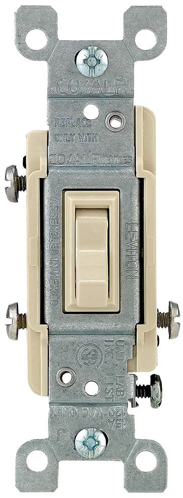 The Leviton 2653-2I is a 3-way toggle switch designed for AC applications. This switch operates at one hundred twenty volts alternating current and handles up to fifteen amperes. It features a grounding design for added safety. Its compact dimensions of four point two inches high by one point thirty-one inches wide and eleven inches deep allow for easy installation in various settings.