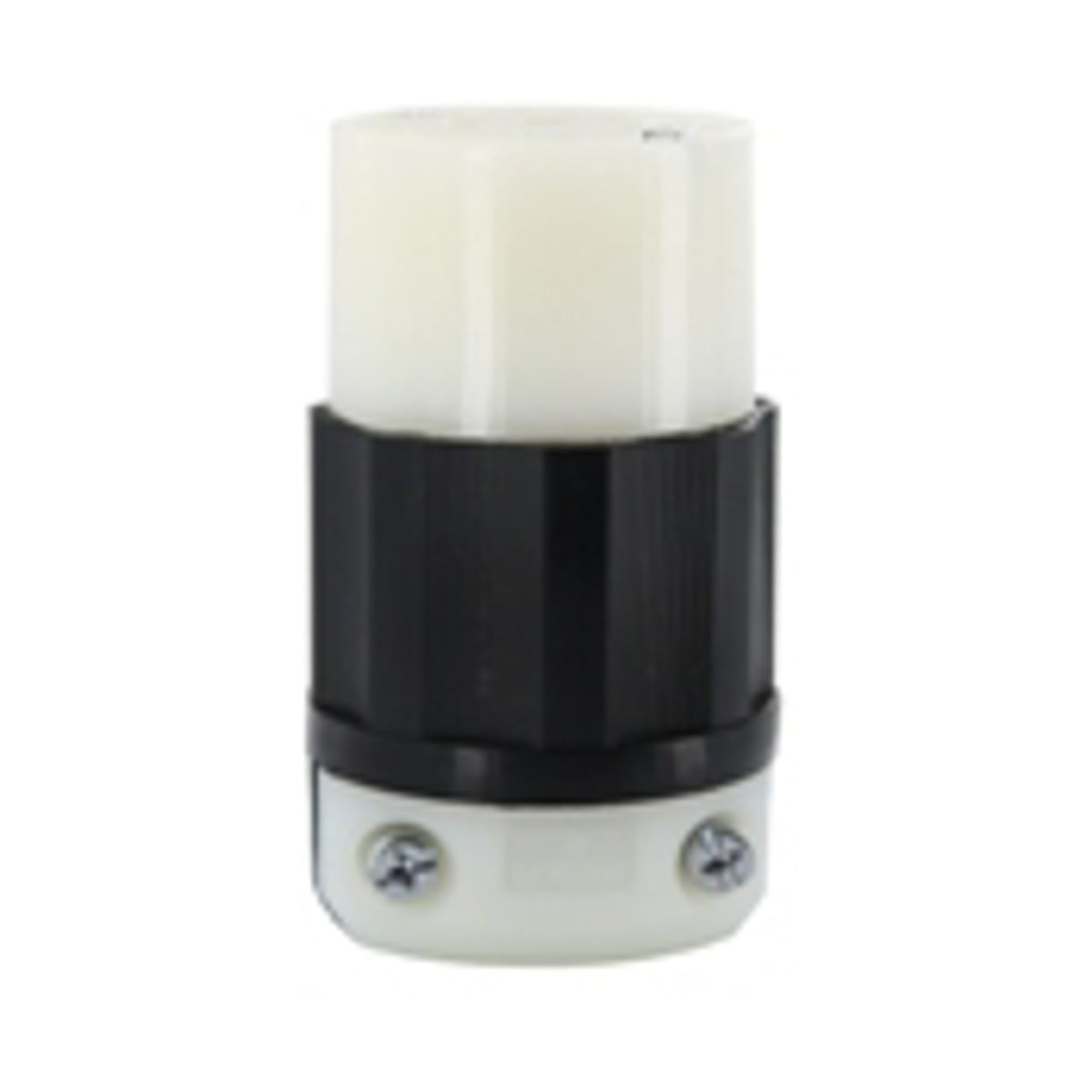 Leviton 3433-C locking connector is designed for 120/208 VAC, 30 A, with a 3-phase non-grounding configuration. This connector is built for tough industrial use and features a nylon construction with a black and white color scheme. Its dimensions are two point twenty-two inches in diameter and three point seventy-eight inches high. Ideal for applications that require a dependable connection under demanding conditions.