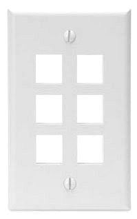 The Leviton 41080-6WP is a single-gang QuickPort wall plate with six ports designed for multimedia applications. This faceplate allows for easy installation where a one-piece, economical flush-mount housing is needed. It accepts QuickPort connectors and is versatile enough to be used in different environments thanks to its simple design and color-matched installation screws.