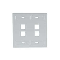 The Leviton 42080-4GP is a 4-port dual-gang wallplate. It is designed for use with QuickPort snap-in modules. This makes it suitable for multimedia installations, allowing flexibility in configuration. The wallplate is made from durable plastic and is compatible with various modules, offering options for port designations. It fits within standard rectangular NEMA openings, making installation straightforward.