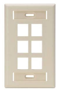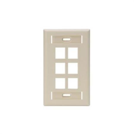 Leviton 42080-6IS QuickPort Wall Plate features a single-gang design with six ports for flexible connectivity. This wall plate is made from durable plastic and is ideal for multimedia applications. The ID window allows for clear labeling, making it easy to manage connections. The QuickPort design ensures compatibility with all QuickPort snap-in modules.