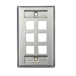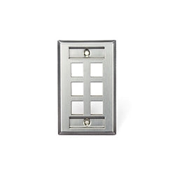 The Leviton 43080-1L6 is a stainless-steel wall plate designed for single-gang installations. This 6-port wall plate accommodates QuickPort snap-in connectors and adapters. It fits standard NEMA electrical boxes. Multiple port configurations are available, supporting various needs for both commercial and residential applications.