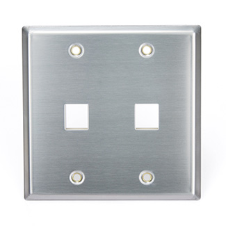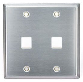 The Leviton 43080-2S2 is a wall plate designed for 2 ports with a double-gang configuration. This product fits standard NEMA electrical boxes and allows for customizable port configurations. Made from stainless steel, it offers a durable and professional appearance.
