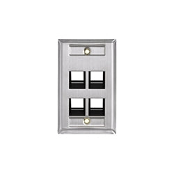 The Leviton 43081-1L4 is an angled wall plate designed for single-gang installations using stainless steel. It is compatible with QUICKPORT snap-in modules, providing versatility for multimedia applications within standard flush-mount housings.