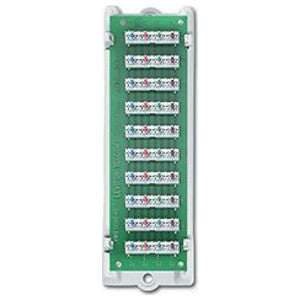 The Leviton 47689-B 1x9 Bridged Telephone Module connects up to four telephone lines to nine outlet locations. This module includes an ABS bracket and a 110 punch down tool for easy installation. It is designed to fit in any Leviton Structured Media enclosure. The module can operate up to nine separate telephones per line and is suitable for various applications including phone, fax, and modem use.