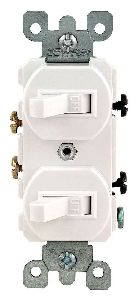 The Leviton 5224-2W is a combination toggle switch designed for both residential and commercial applications. This device supports a maximum current of fifteen amperes and operates at voltages of both one hundred twenty and two hundred seventy-seven volts. The toggle switch fits into standard wallboxes and is easy to install, making it an excellent choice for electricians and builders.