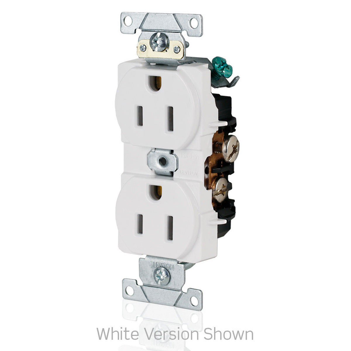 The Leviton 5242-R is a duplex receptacle designed for heavy-duty use. This receptacle operates at 15 amps and 125 volts. It has been engineered for commercial applications, making it suitable for various settings.
