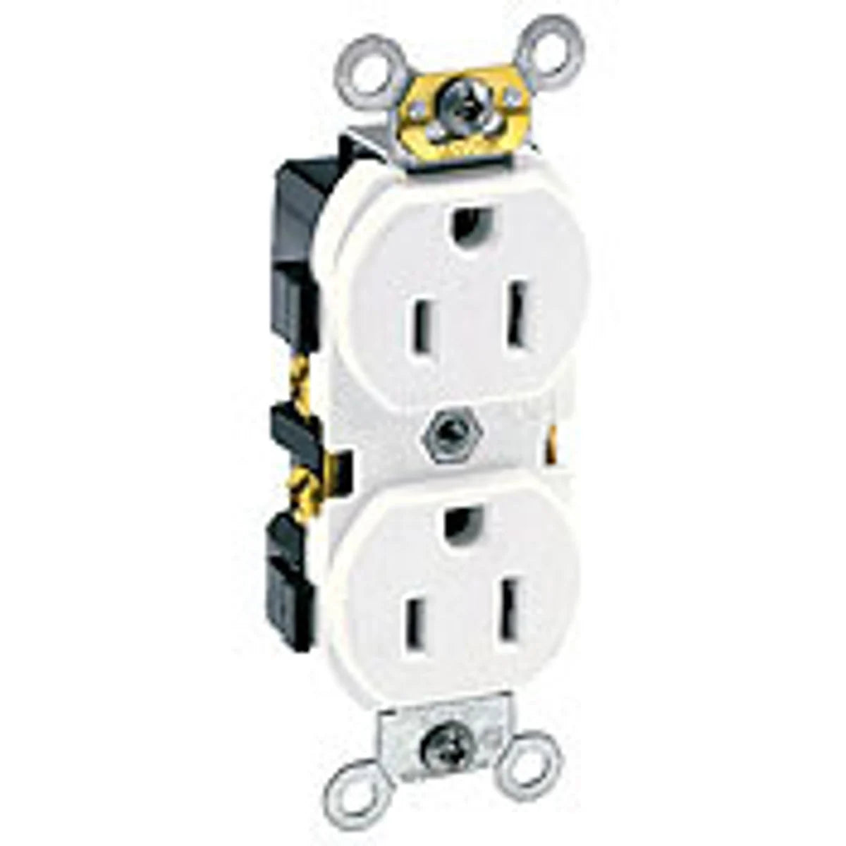 The Leviton 5242-W is a durable duplex receptacle designed for industrial applications. It operates at 15 Amps and 125 Volts, featuring a self-grounding design. This receptacle is suitable for commercial use, providing reliable power access in demanding environments.