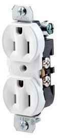 The Leviton 5320-CP is a duplex grounding straight blade receptacle with a voltage rating of one hundred twenty-five volts and an amperage rating of fifteen amps. It features two poles and three wires, designed for demanding commercial environments. This receptacle is constructed from durable thermoplastic and is suitable for various applications.