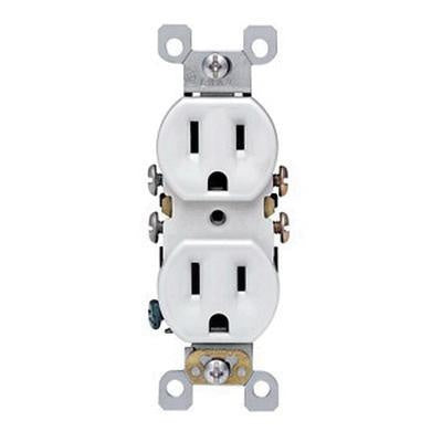 The Leviton 5320-SW is a 15 Amp, 125 Volt duplex receptacle. It is designed for residential applications and features a self-grounding mechanism. The receptacle offers quickwire push-in and side wiring options for easy installation.