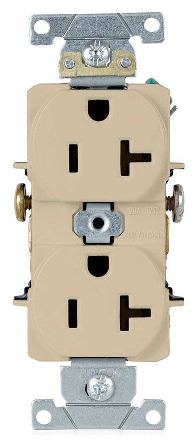 The Leviton 5342-I is a heavy-duty straight blade duplex receptacle. This device operates at one hundred twenty-five volts and supports a maximum amperage of twenty amps. It is suitable for various applications including commercial use. Designed from durable thermoplastic nylon, this receptacle offers reliable performance in demanding environments.