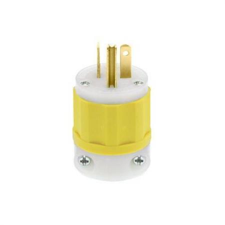 The Leviton 5366-CY is a high visibility straight blade plug designed for industrial applications. It operates at one hundred twenty-five volts and supports twenty amperes. This device is constructed from nylon for durability and is suitable for various cord sizes ranging from a quarter inch to six hundred eighty-five thousandths of an inch in diameter.