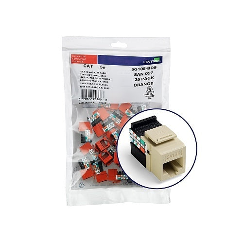 The Leviton GigaMax 5G108-BI5 is a CAT5E channel-rated keystone jack. It is designed for flexibility in structured cabling systems. This product supports high port density in a small area. Ideal for residential and high-megabit applications.