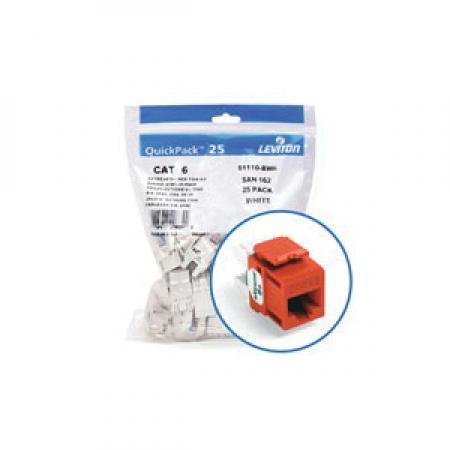The Leviton 61110-BO6 eXtreme CAT6 QuickPort Jack QuickPack contains 25 high-performance connectors. These jacks are designed to work with QuickPort compatible products. Their unique design supports 8P8C connections for data and voice applications.