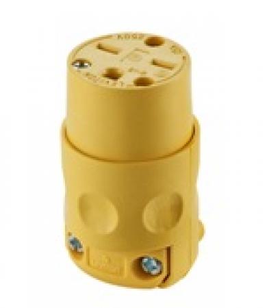 The Leviton 615CV is a 15 Amp, 250 Volt NEMA 6-15R round dead front connector. It features a robust PVC body designed for durability in commercial settings. The connection supports two poles and three wires, making it suitable for various electrical applications. This connector is particularly effective for outdoor use due to its grounding capabilities and moisture resistance.