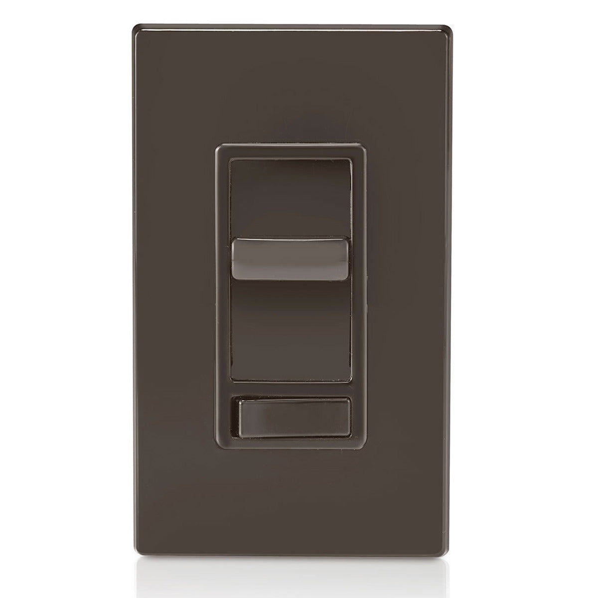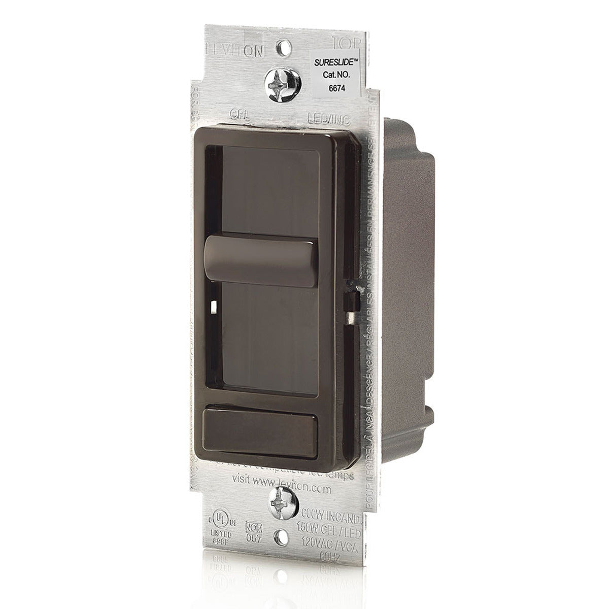 The Leviton 6674-P0B is a LED and CFL Incandescent Dimmer rated at 150 watts, designed for universal compatibility. This dimmer switch is suitable for wall mounting, and it operates on 120 VAC. It supports a range of lamp types including CFL, LED, and incandescent lamps. The dimmer includes a slide control for easy adjustment of brightness levels and a separate ON/OFF switch for added functionality.
