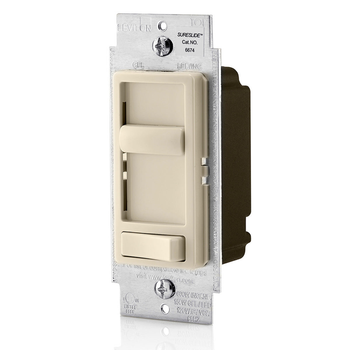 The Leviton 6674-P0T SureSlide Dimmer allows users to control lighting with ease. This dimmer supports a maximum load of six hundred Watts for incandescent and halogen bulbs and one hundred fifty Watts for dimmable LED and CFL bulbs. It is compatible with both single pole and three-way configurations using a separate three-way switch.