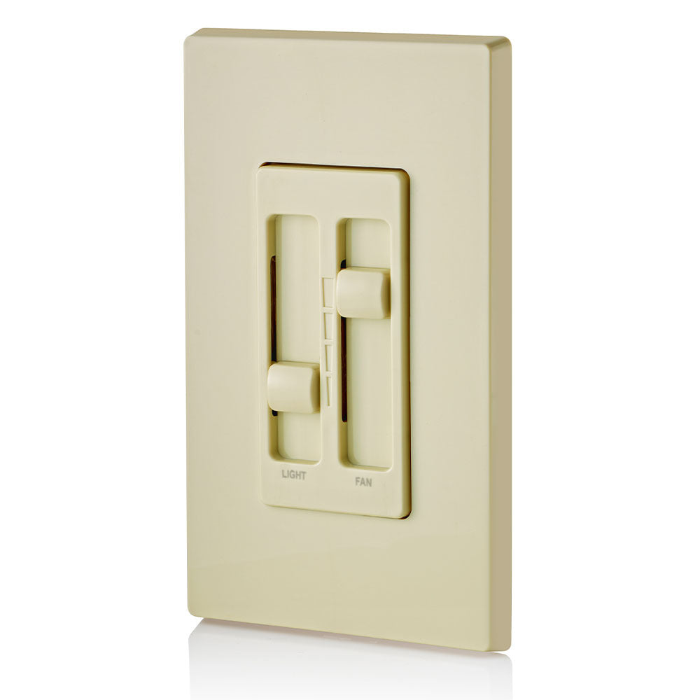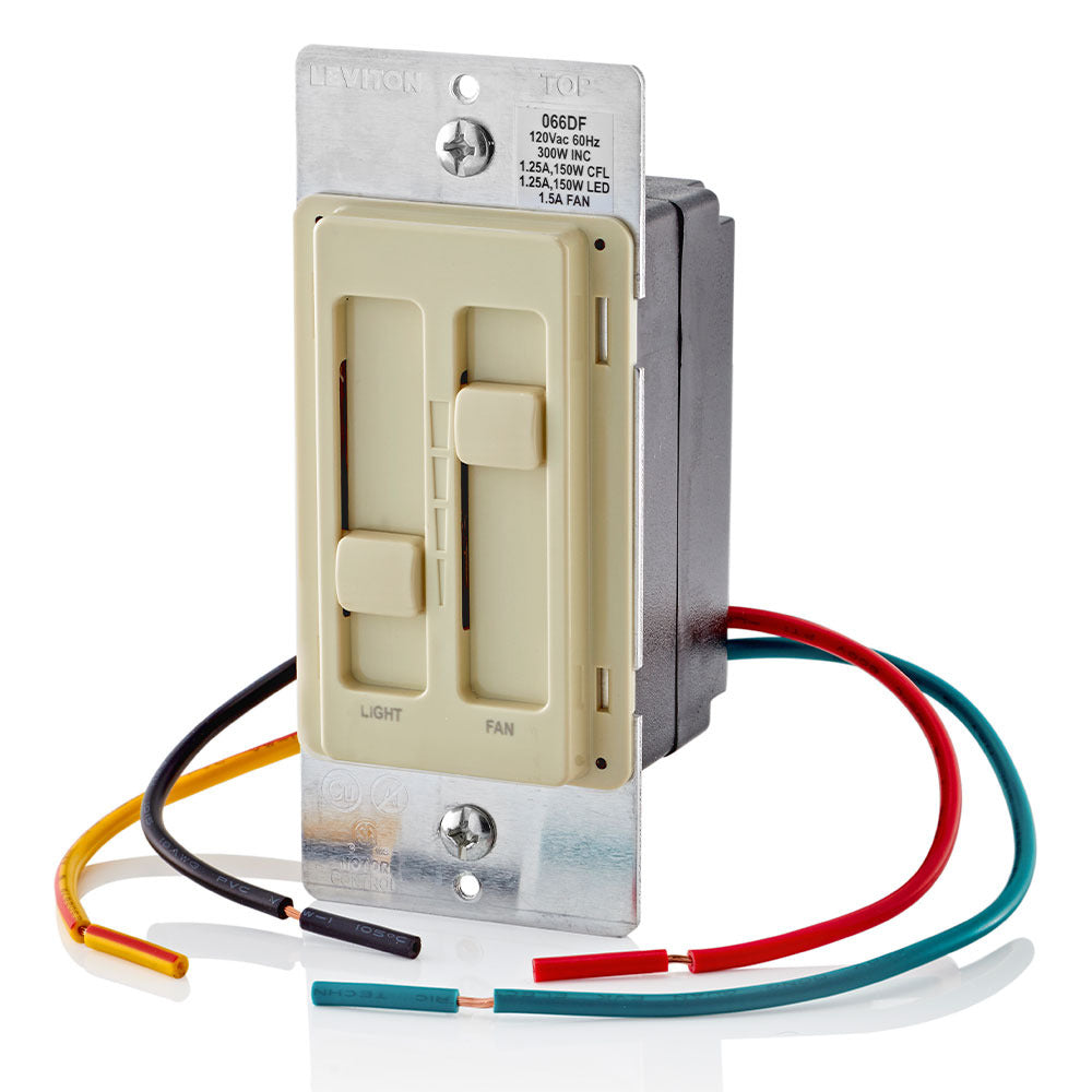 The Leviton 66DF-10I is a SureSlide Dual Quiet Fan and Light Control. This device allows you to control both the fan speed and the light dimming. It operates at 150 watts for dimmable LED and CFL lamps and 300 watts for incandescent lamps, with a single pole configuration.