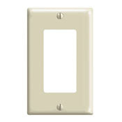 The Leviton 80401-I 1-Gang Decora Wallplate is made from thermoset plastic and measures four and one-half inches high by two and three-fourths inches wide. This wallplate is designed to fit Decora and GFCI devices. It features a cutout of two point six three inches by one point three one inches for easy device connectivity. The smooth face and rounded edges help prevent dust accumulation, making it easy to maintain cleanliness. This wallplate is suitable for both residential and commercial applications.