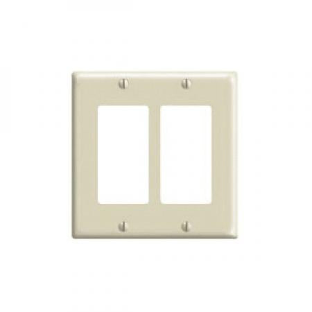 Leviton offers the 80409-I Decora 2-Gang GFCI Device Wallplate in ivory. This standard-sized wallplate is designed for use with two GFCI devices. The thermoset material ensures durability and provides high dielectric strength. It is non-combustible and includes a smooth surface that resists dust accumulation. The wallplate measures four point five inches in height and four point five six inches in width, with cutouts sized one point three two inches by two point six four inches for easy installation.