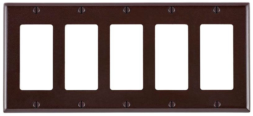 The Leviton 80423 is a 5-gang wall plate designed for standard devices. It is constructed from thermoset material and comes in a brown finish. This wall plate is compatible with Decora and GFCI devices, providing a sleek surface that resists dust accumulation.