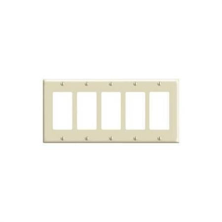 The Leviton 5-Gang Decora/GFCI Device Wallplate, MPN 80423-I, is designed for use in both residential and commercial applications. This wallplate features a standard size with a thermoset construction and is available in an ivory color. It provides a neat and convenient solution for covering multiple outlets, making it suitable for various setups.