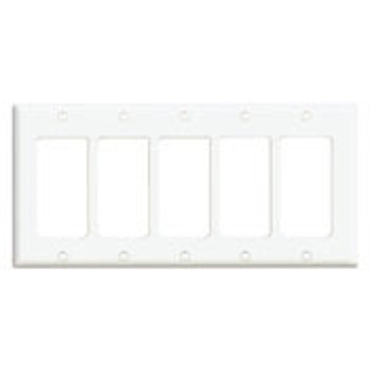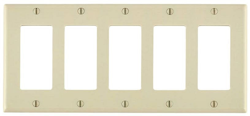 The Leviton 80423-T is a standard size 5-gang wallplate made from thermoset material in light almond color. This wallplate can be used in both residential and commercial settings. Its sleek design allows it to blend seamlessly with various wall coverings while providing useful functionality.