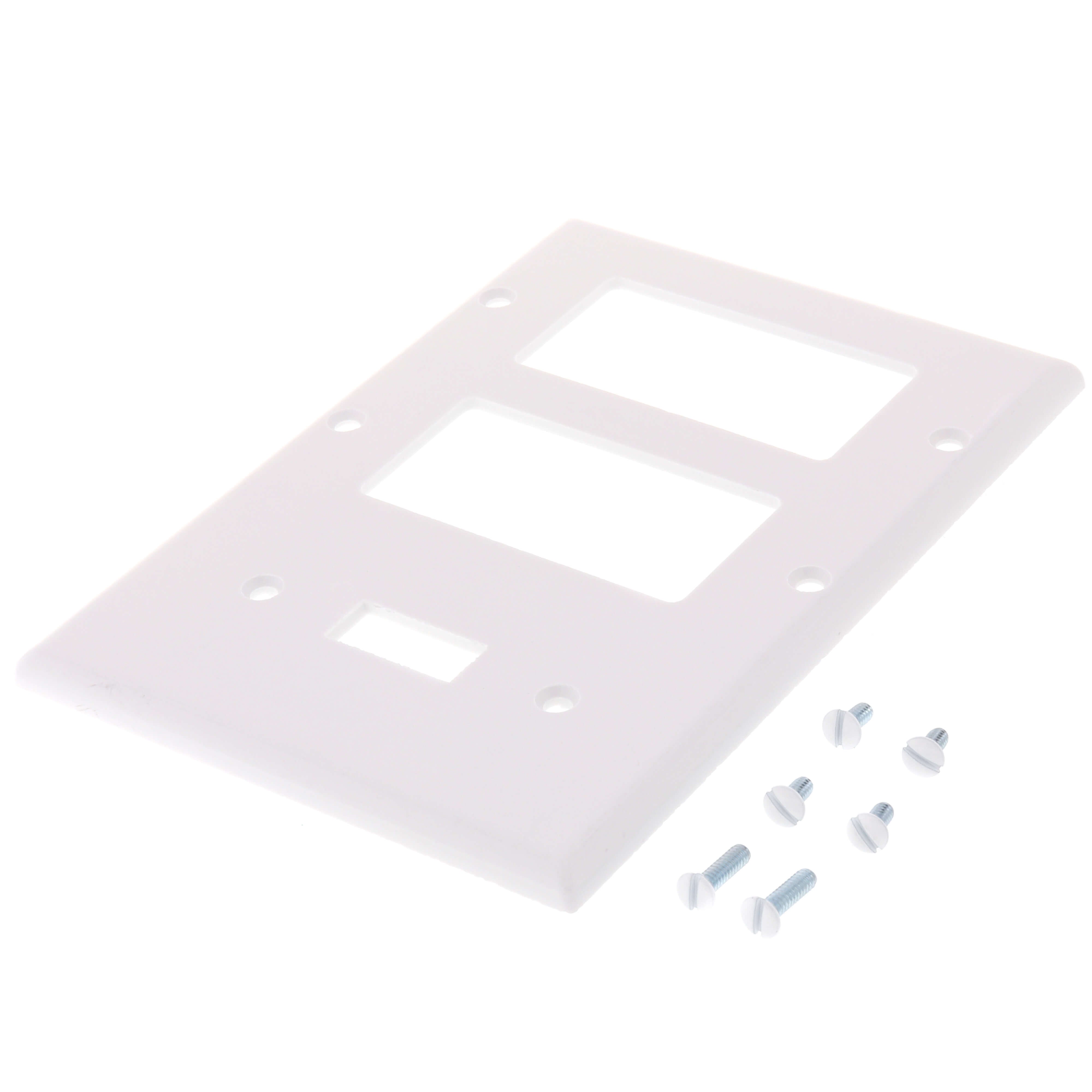 The Leviton 80431-W is a combination wallplate designed for standard size applications. This wallplate accommodates three gangs, featuring two Decora/GFCI openings and one toggle switch. The dimensions are four point five inches in height and six point thirty-eight inches in width. It is crafted from thermoset material, offering durability and ease of installation.