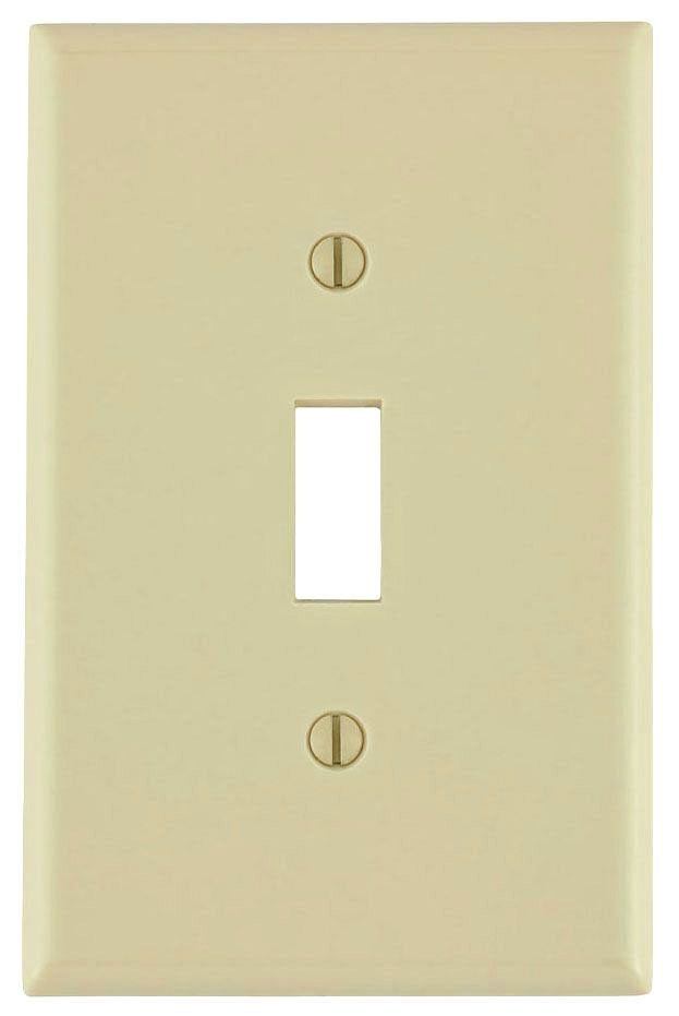 The Leviton 80501-I is a traditional wallplate designed for one gang installations. It measures four and seven-eighths inches in height and three and one-eighth inches in width. This wallplate features a toggle switch cutout measuring zero point nine four two inches in height and zero point four zero six inches in width. The material is thermoset plastic, ideal for residential and commercial applications.