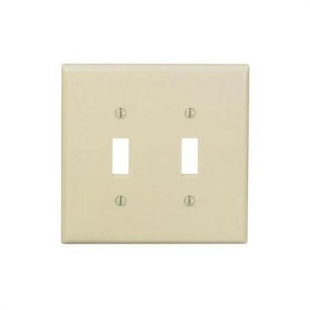 The Leviton 80509-I is a wallplate designed for traditional Leviton devices. It accommodates two gangs and measures four point eight seven five inches high by four point nine four inches wide. This wallplate is made from durable thermoset material in an ivory finish.