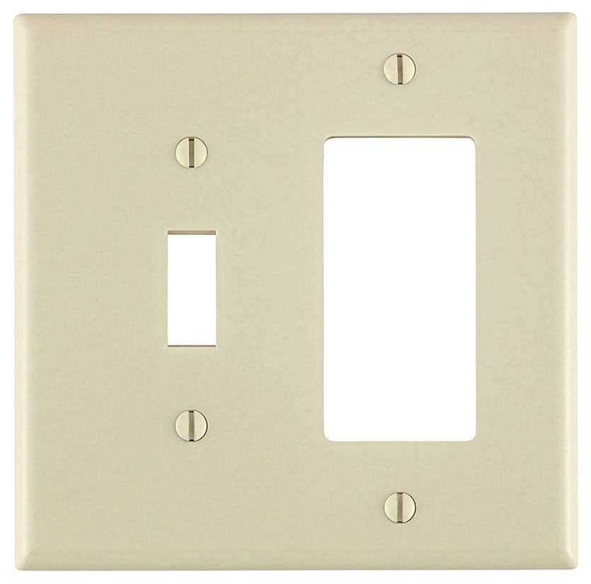The Leviton 80605-T combination wall plate is designed for use in both residential and commercial settings. It features a midway size and accommodates two gangs, with one toggle and one decorator/GFCI cutout. The product dimensions are four point nine four inches in width and four point eight seven five inches in height.