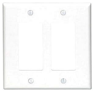 Leviton 80609-W is a 2-gang Decora wallplate designed for midway installation. It is made from thermoset material and available in white. This wallplate fits over larger-volume outlet boxes and helps hide wall imperfections around switches and outlets. The color-matched screws included in the package ensure seamless installation.