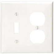 The Leviton Combination Wallplate, model 80705-T, is designed for use in standard electrical installations. It features dual gang compatibility with one toggle and one duplex outlet. The unit is constructed from thermoplastic material and comes in a light almond color, enhancing its durability for residential and commercial applications.