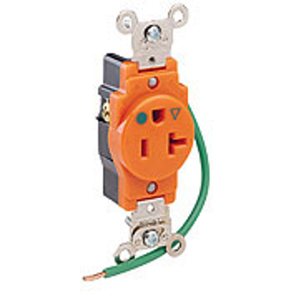 Leviton 8310-OIG is an extra heavy-duty isolated ground single straight blade receptacle. This receptacle supports a voltage rating of one hundred twenty-five VAC and an amperage rating of twenty A. It is designed for applications that require two poles and three wires. This product is suitable for hospital-grade installations and can handle a horsepower rating of one HP.