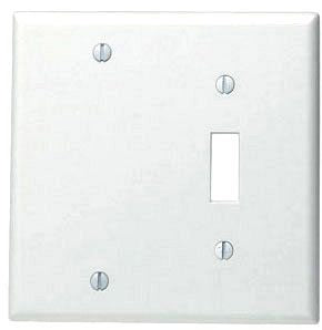 The Leviton 84006-40 is a combination wall plate designed for standard installations. This product features two gangs, with one toggle switch and one blank cutout. Constructed from 302 stainless steel, it has a brushed finish that ensures durability. This wall plate can be used in both commercial and residential settings, making it a versatile choice for various applications.
