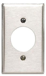 The Leviton 84028 is a 1-gang wallplate specifically designed for use with Leviton devices. This wallplate accommodates a 2.15 inch diameter receptacle hole and is constructed from 430 stainless steel for durability and longevity. It features a flush mounting design that fits securely against the wall.