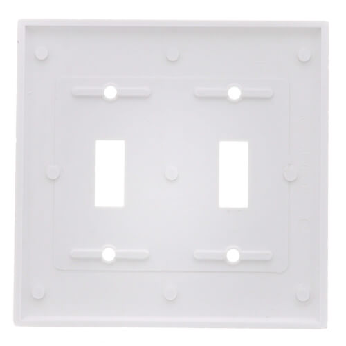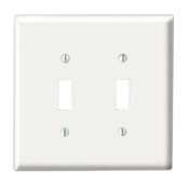 The Leviton 88009 wall plate is a standard size, two-gang toggle switch cover made from thermoset plastic. This wall plate measures four and a half inches high by four and fifty-six inches wide, featuring a toggle switch cutout of zero point nine hundred forty-two inches height by zero point four hundred six inches width. It provides a clean and functional design suitable for both new and retrofit constructions. The product is quickly and easily installed and includes mounting screws.