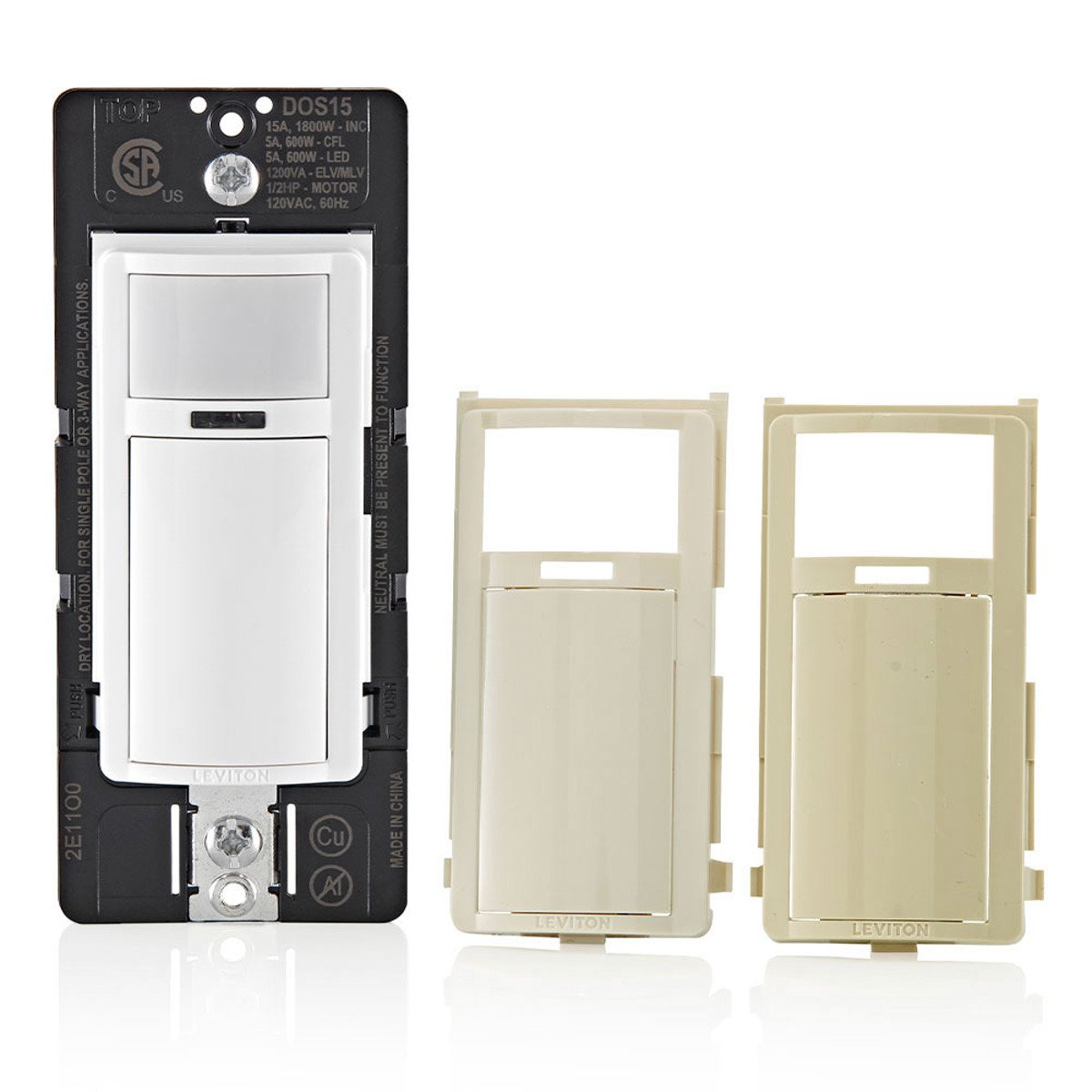 The Leviton DOS15-1LZ is an occupancy sensor designed for efficient lighting control. This sensor operates at one hundred twenty volts and has a fifteen amp capacity. It uses passive infrared technology to detect motion and automatically turn lights on and off, making it ideal for residential applications.
