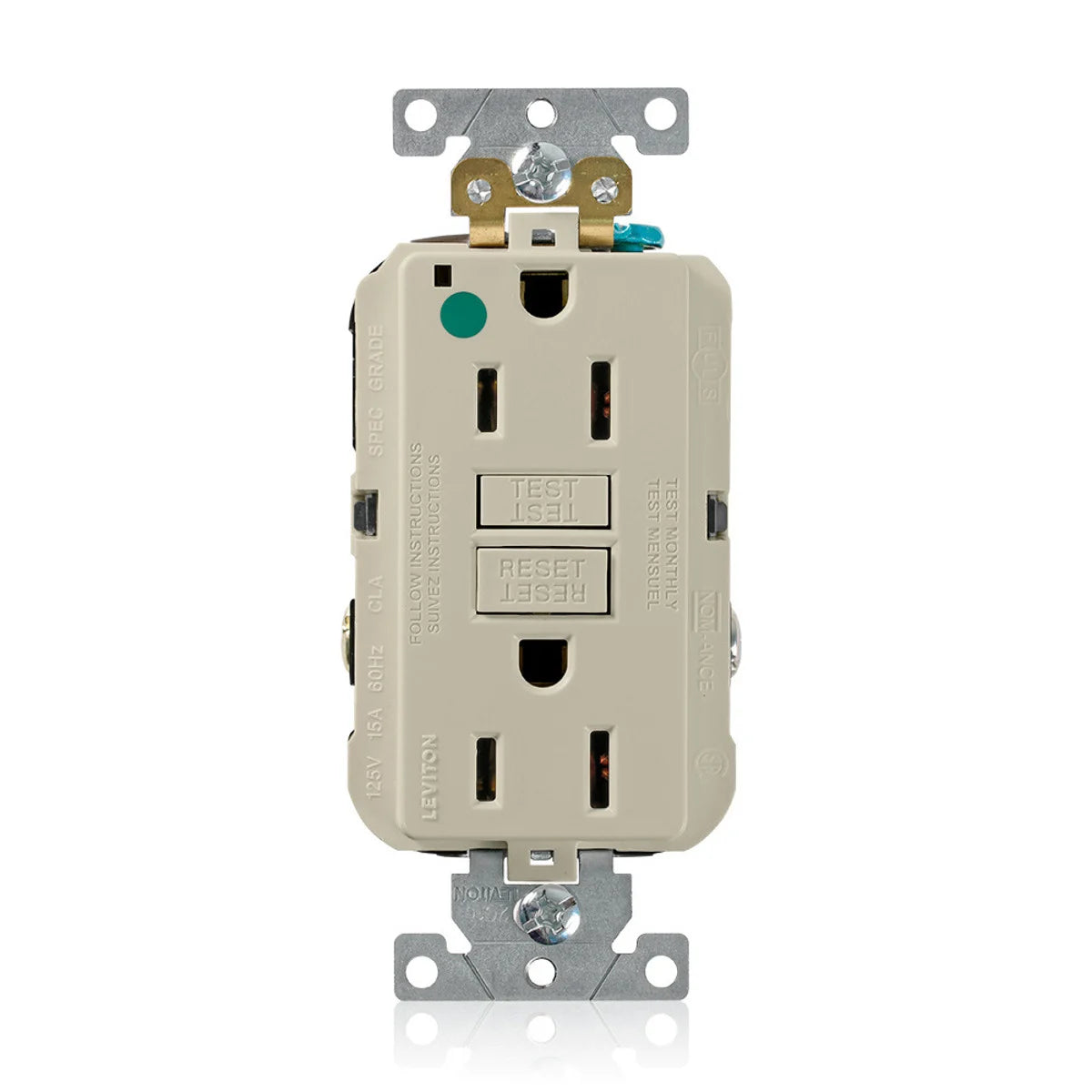 Leviton GFNT1-HGI SmartlockPro Slim Self-Test GFCI Receptacle is designed for safety and reliability. This receptacle operates at 125 volts and can handle up to 15 amps. It features a feed-through design and is suitable for extra-heavy duty and hospital-grade applications. The matching wallplate is included for a complete installation.