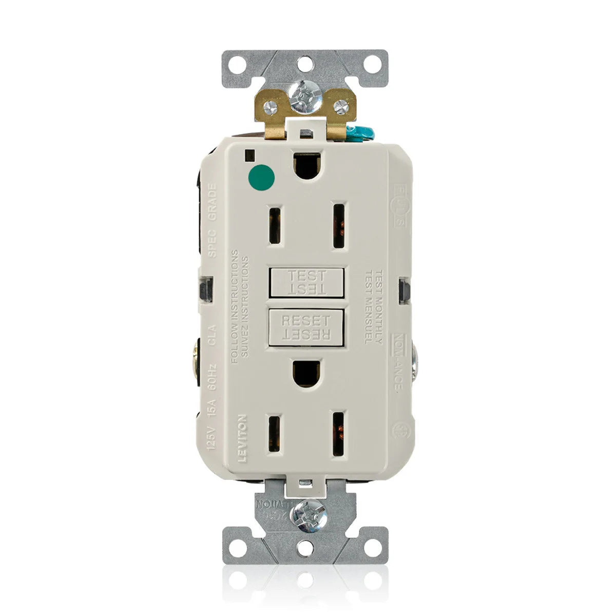 Leviton GFNT1-HGT SmartlockPro Slim Self-Test GFCI Receptacle is a reliable device designed for safety in wet areas. It operates at one hundred twenty-five volts with a fifteen amp rating.