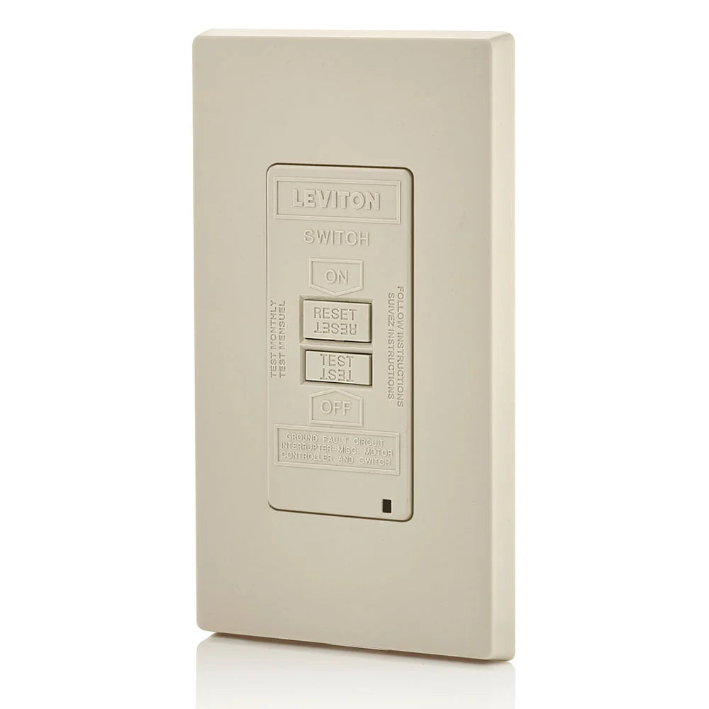 The Leviton GFRBF-T is a self-test blank face GFCI receptacle rated for twenty amperes and one hundred twenty-five volts. This device features a sleek design that fits in shallow electrical boxes. It provides reliable ground fault protection and is suitable for residential applications.