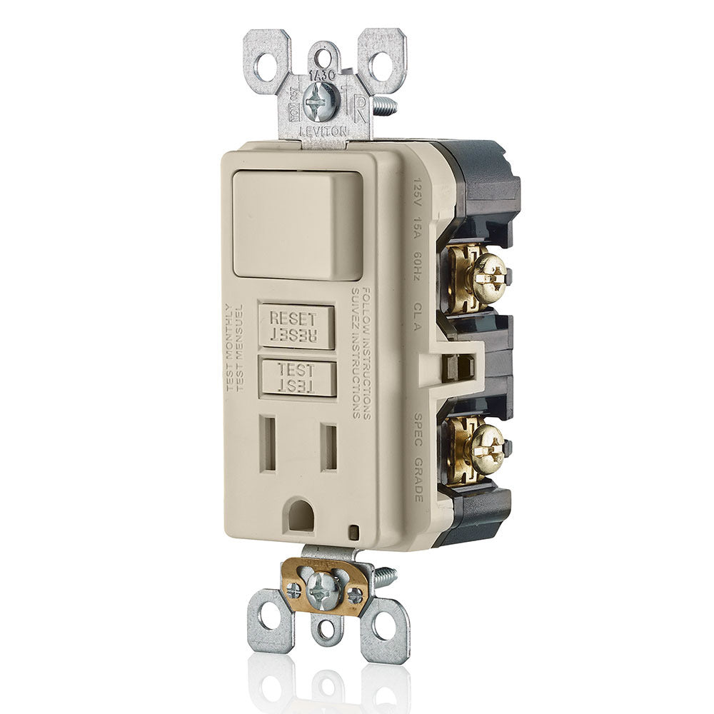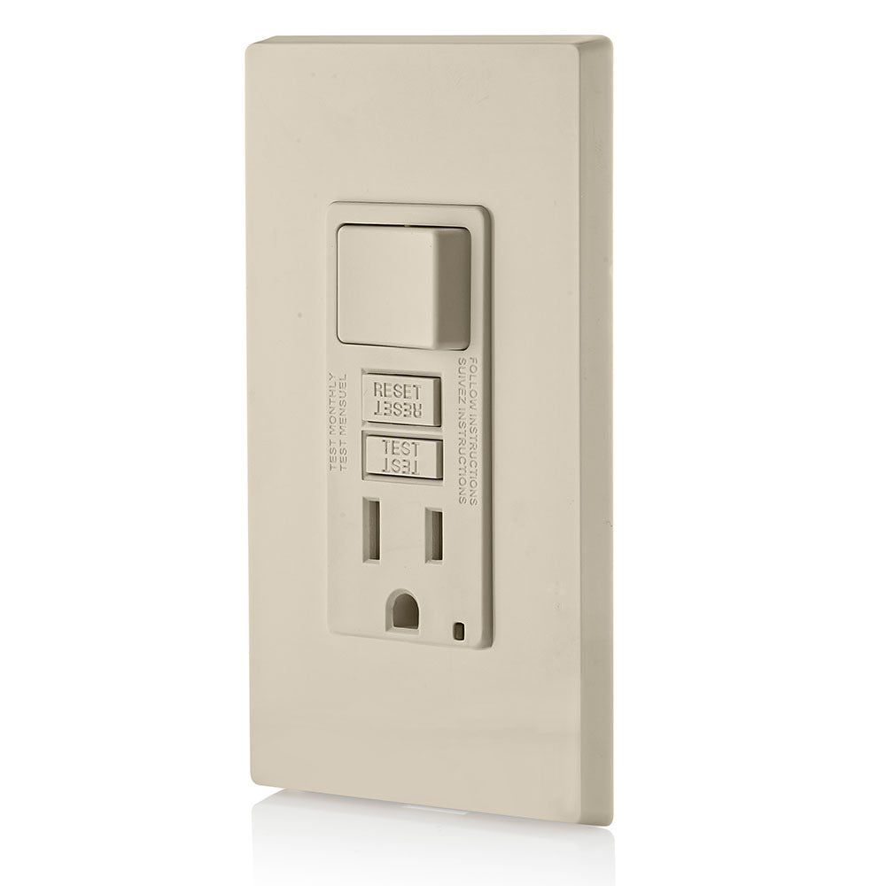 The Leviton GFSW1-T is a SmartlockPro Slim GFCI combination switch. This device features a tamper-resistant receptacle and an LED indicator. It operates at 15 Amperes and 125 Volts, with a switch capacity of 1800 Watts at 120 Volts AC. It has a monochromatic design and supports back and side wiring. The wallplate and faceplate are sold separately. A self-grounding clip is included, and the color is light almond.