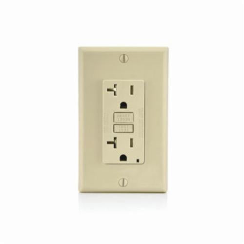 The Leviton GFTR2-I is a shallow tamper-resistant GFCI receptacle designed for safe electrical connections in residential and commercial settings. This device operates at 20 amperes and 125 volts, with a feed-through capability and test and reset buttons.