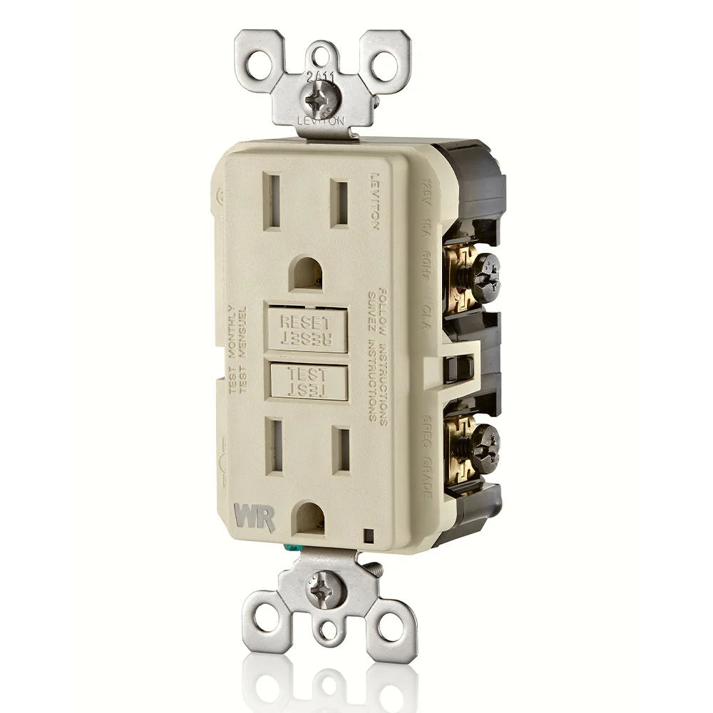 Leviton GFWT1-T is a self-test tamper-resistant and weather-resistant GFCI receptacle designed for safety and convenience. This model operates at fifteen amps and is suitable for general use in residential and commercial applications. It features a feed-through rating of twenty amps, ensuring compatibility with various electrical systems.